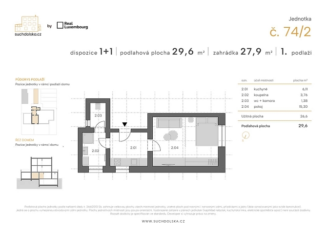 Nabízíme k prodeji moderní a nově zrekonstruovanou světlou jednotku o celkové ploše 29,2 m² s dispozicí 1+1 v 1. nadzemním podlaží. Jednotka se skládá z pokoje o ploše 15,30 m², kuchyně s přípravou pro kuchyňskou linku o ploše 6,11 m², kompletně zařízenou koupelnou s podlahovým vytápěním o ploše 3,76 m² a toaletou o velikosti 1,38 m². Součástí nabídky je také zahrádka o velikosti 27,9 m².