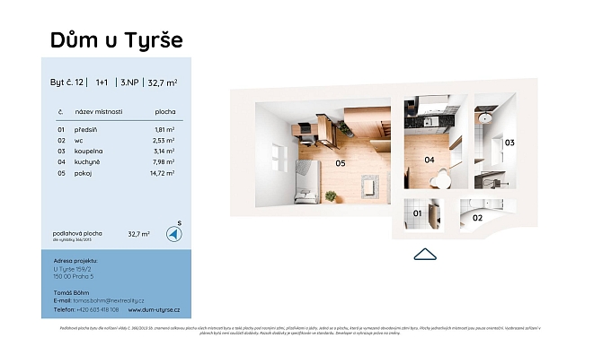 Dovolujeme si vám nabídnout projekt „Dům U Tyrše". Tento projekt vznikl rekonstrukcí historického bytového domu v prestižní pražské lokalitě Košíře. Rekonstrukcí vznikne 23 moderních rezidenčních jednotek a ateliérů, které nabídnou komfortní a moderní bydlení v atraktivní lokalitě s výbornou dostupností do centra Prahy. Nabízíme k prodeji byt o celkové ploše 32,7 m2 v 3.NP rezidence ,,Dům u Tyrše". Jednotka se skládá z pokoje o ploše 14,72 m2, z kuchyně s přípravou na kuchyňskou linku o ploše 7,98 m2, předsíní o ploše 1,81 m2, kompletně zařízenou koupelnou se sprchovým koutem o ploše 3,14 m2 a toaletou o ploše 2,53 m2 Byt je vhodný jako investiční příležitost nebo startovací byt ve velmi žádané lokalitě. V docházkové vzdálenosti se nachází tramvajová zastávka U Zvonu, z které jste za 3 minuty na metru "B" Anděl, kde se nachází OC Nový Smíchov, multikina, restaurace, poliklinika, MŠ, ZŠ a veškerá další infrastruktura. K odpočinku lze využít nedalekou náplavku, Petřínské sady nebo vyhlášené Švandovo divadlo. Součástí naší nabídky je kompletní servis, tedy právní služby a zajištění všech potřebných dokumentů, pomoc se zajištěním financování, pojištění nemovitosti i domácnosti, přepisy energií. Pouze u nás vám zajistíme moderní financování až na 30 let, bez ohledu na věk a prokazování příjmů, či nutnosti předkládat daňové přiznání (u podnikatelů). Zeptejte se nás a bydlete chytře! Bližší informace Vám rád sdělím na osobní prohlídce tohoto bytu. Pro komunikaci uvádějte evidenční číslo zakázky N109793.