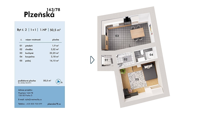 Bytová jednotka disponuje 46,7m2 se nachází v 1NP činžovního domu a okna směřují do klidného vnitrobloku. Dispozice: ložnice (16,15m2), kuchyň (22,25m2), koupelna s toaletou (2,88m2), předsíň (1,9m2), chodba (3,52m2). Byt je v dobrém stavu a v současné době je pronajat – nájem je platný do 31.3. 2024.