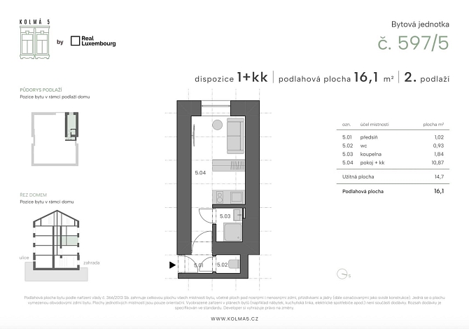 Tato konkrétní jednotka č.5 o dispozici 1kk a podlahové ploše 16,1 m2 se nachází ve 2 nadzemním podlaží s výhledem do zahrady. Je členěna na vstupní chodbu, oddělenou koupelnu, samostatnou toaletu a obývací pokoj s kuchyňským koutem. Přesné rozložení si můžete prohlédnout na přiloženém půdorysu. Vytápění je řešeno elektrickými přímotopy a ohřev vody elektrickým bojlerem.