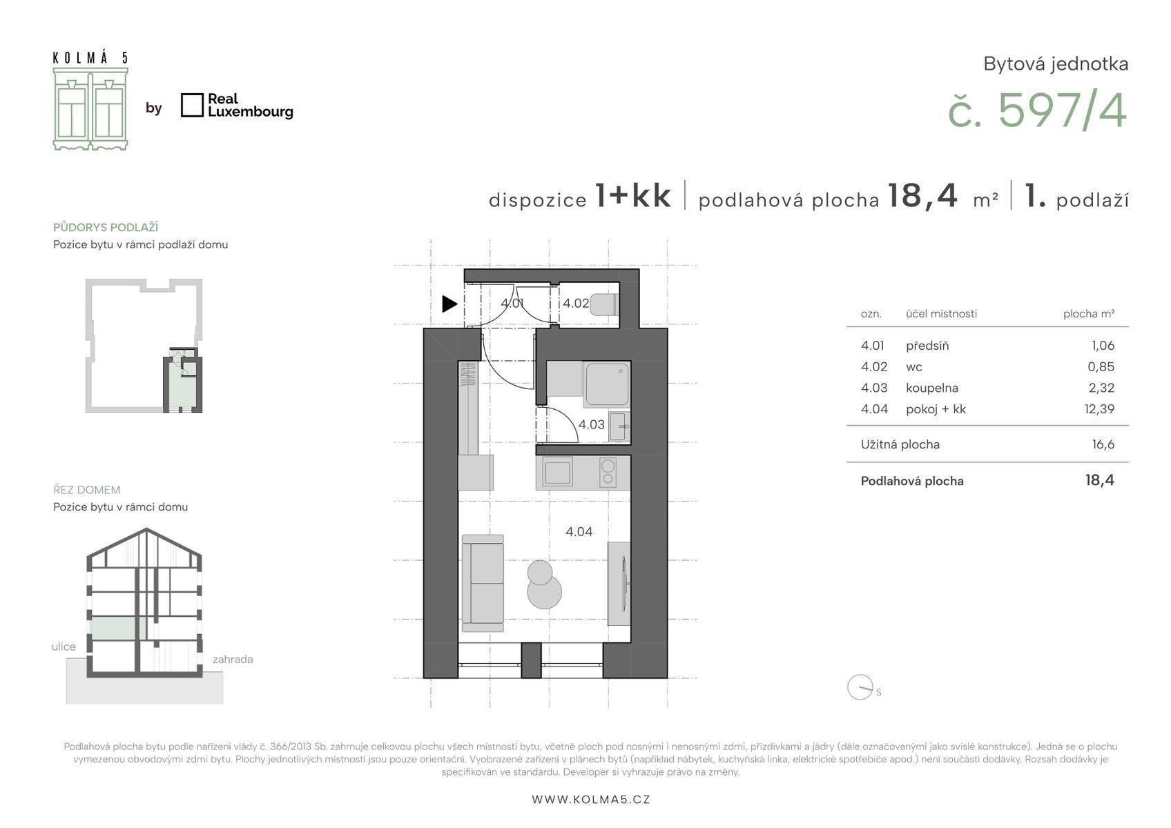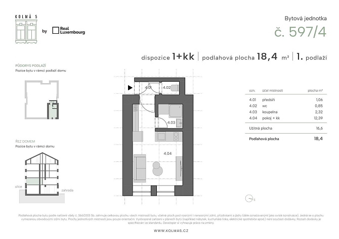 Tato konkrétní jednotka č.4 o dispozici 1kk a podlahové ploše 18,4 m2 se nachází v 1 nadzemním podlaží s výhledem do ulice. Je členěna na vstupní chodbu, oddělenou koupelnu a toaletu a obývací pokoj s kuchyňským koutem. Přesné rozložení si můžete prohlédnout na přiloženém půdorysu. Vytápění je řešeno elektrickými přímotopy a ohřev vody elektrickým bojlerem.