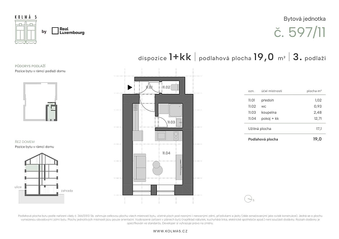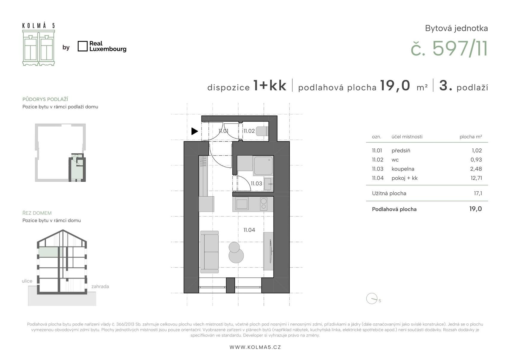Tato konkrétní jednotka č.11 o dispozici 1kk a podlahové ploše 19 m2 se nachází v 3 nadzemním podlaží s výhledem do ulice. Je členěna na vstupní chodbu, oddělenou koupelnu a toaletu a obývací pokoj s kuchyňským koutem. Přesné rozložení si můžete prohlédnout na přiloženém půdorysu. Vytápění je řešeno elektrickými přímotopy a ohřev vody elektrickým bojlerem.