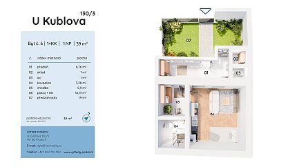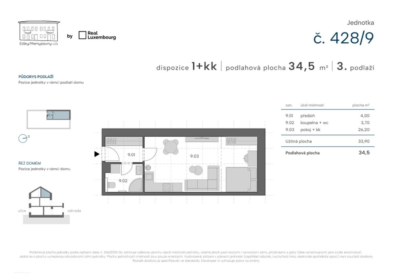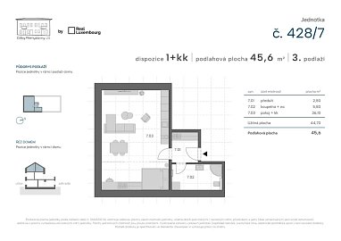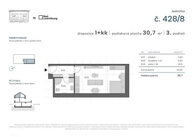 Moderní a prostorná jednotka o dispozici 1+kk (34 m²).