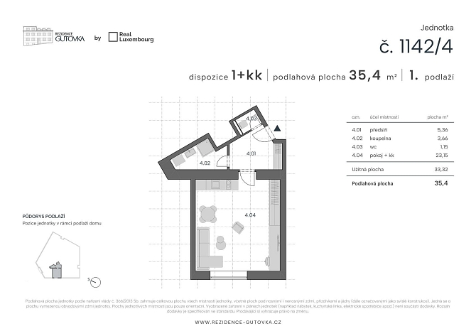 K prodeji nabízíme moderní a nově zrekonstruovanou jednotku s dispozicí 1+KK umístěnou v 1. nadzemním podlaží s celkovou plochou 35,4 m2. Jednotka se skládá z pokoje s kuchyňským koutem a přípravou na kuchyňskou linku (23,2 m²), kompletně zařízené koupelny se sprchovým koutem a podlahovým vytápěním (3,7 m²), předsíně (5,4 m²) a samostatného WC (1,2 m²).