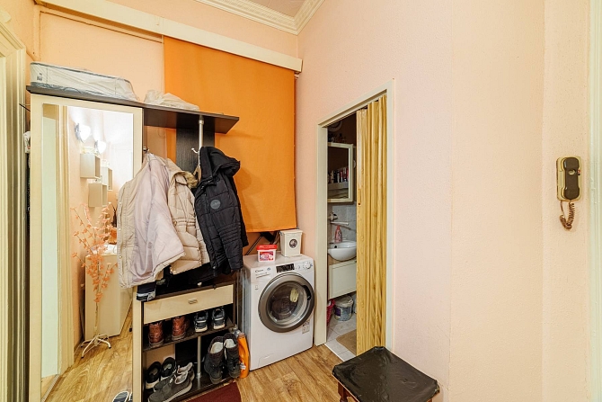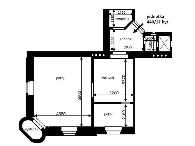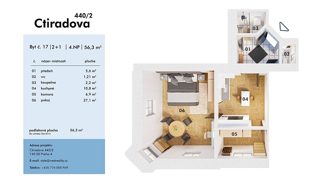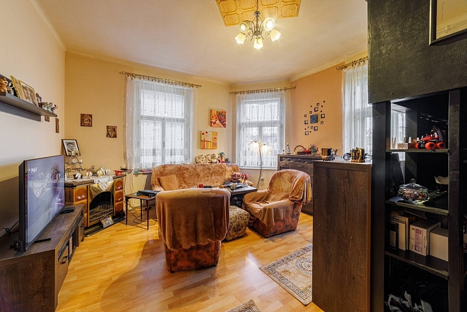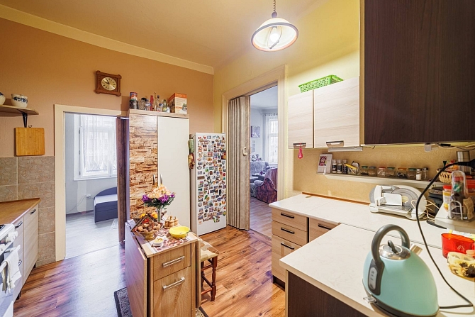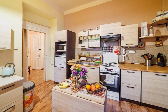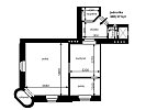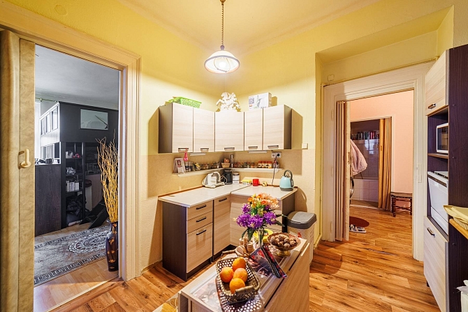 Byt o podlahové ploše 56,3 m2 se nachází ve 4.NP činžovního domu a disponuje obývacím pokojem (27,1 m2), kuchyní (10,8 m2), komorou s oknem, uzpůsobenou jako malý pokoj (6,9 m2), předsíní s chodbou (5,6 m2), koupelnou s vanou (2,2 m2) a samostatnou toaletou (1,2 m2).