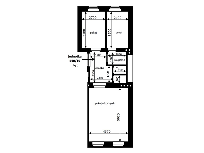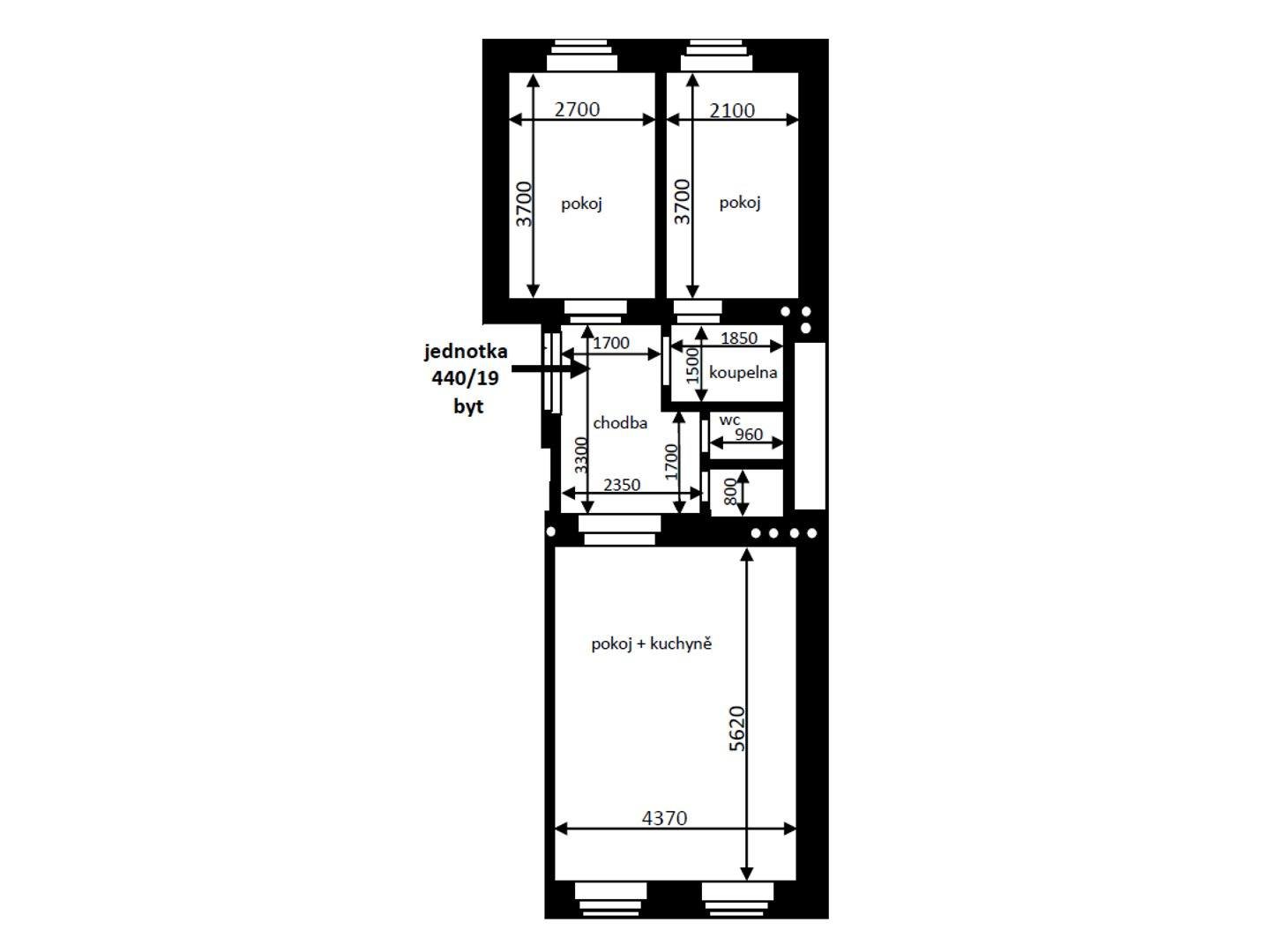 Byt o podlahové ploše 59 m2 se nachází ve 4.NP činžovního domu a disponuje obývacím pokojem (24,6 m2), ložnicí (10 m2), kuchyní (7,8 m2), předsíní s chodbou (9,4 m2), koupelnou a totaletou (1,8 m2).
