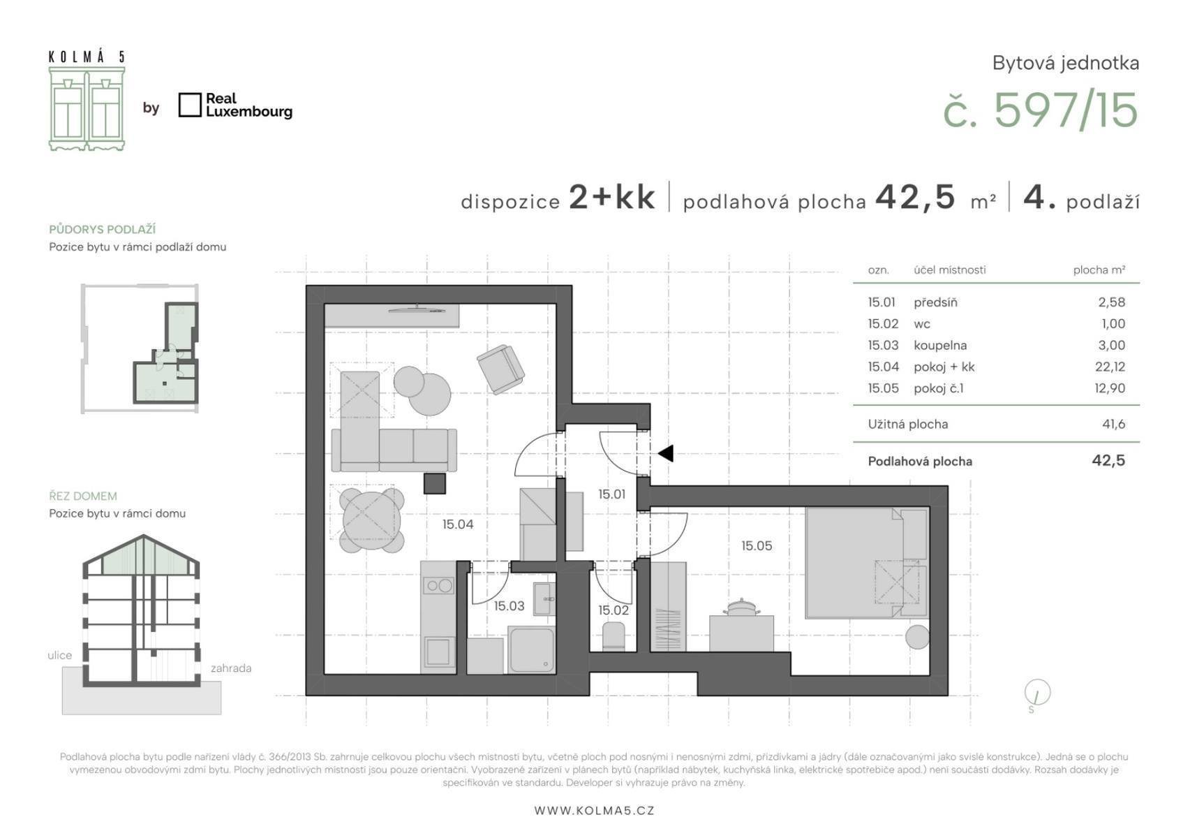 Tato konkrétní jednotka č.15 o dispozici 2kk a podlahové ploše 43 m2 se nachází ve 4 nadzemním podlaží s výhledem jak do ulice, tak do zahrady. Je členěna na vstupní chodbu, samostatnou toaletu, obývací pokoj s kuchyňským koutem, ze kterého je přístup do koupelny a oddělenou ložnici. Přesné rozložení si můžete prohlédnout na přiloženém půdorysu.