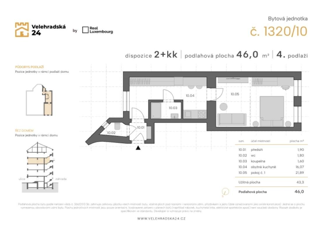 V exkluzivním zastoupení majitele vám k prodeji nabízíme nově zrekonstruovaný byt s dispozicí 2kk s vysokými stropy, o podlahové ploše 46 m² v projektu „Rezidence Velehradská“, ze kterého přímo dýchá duch první republiky.