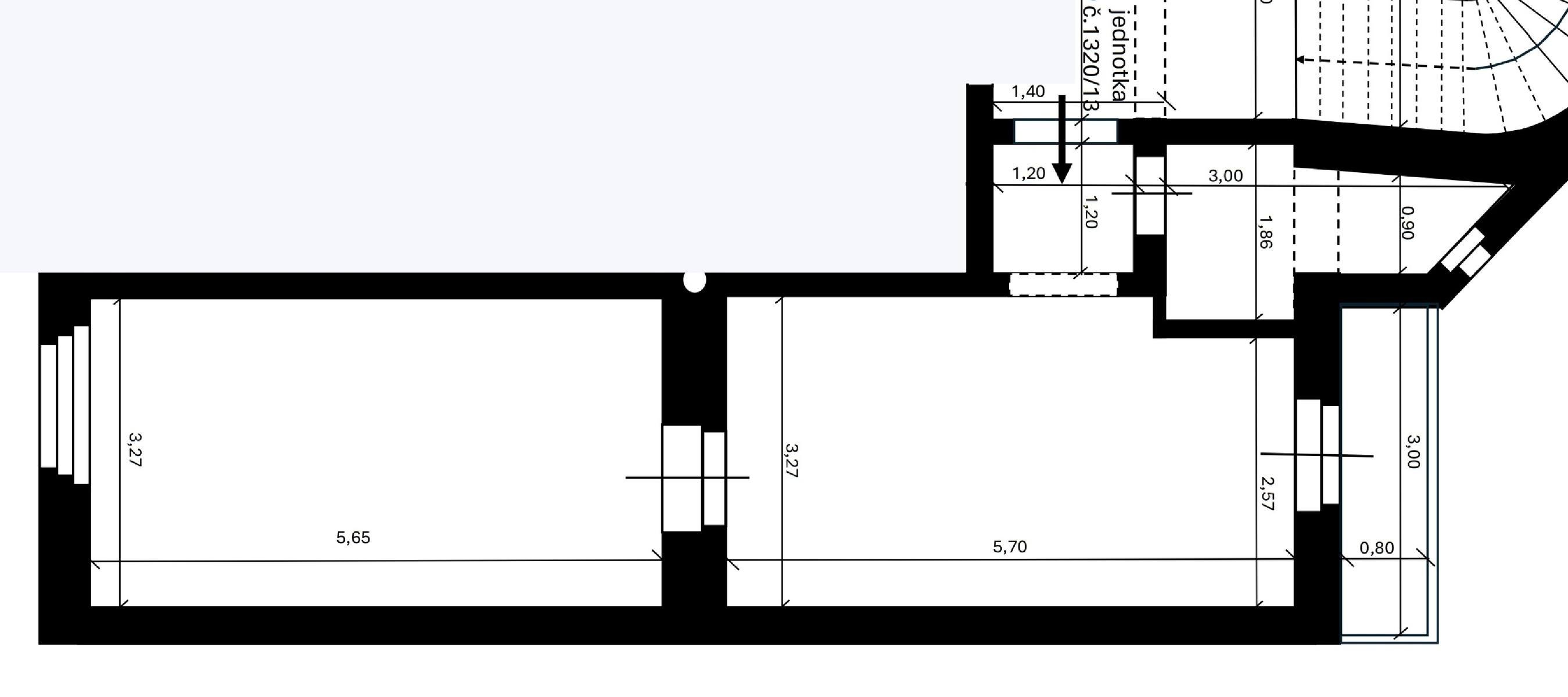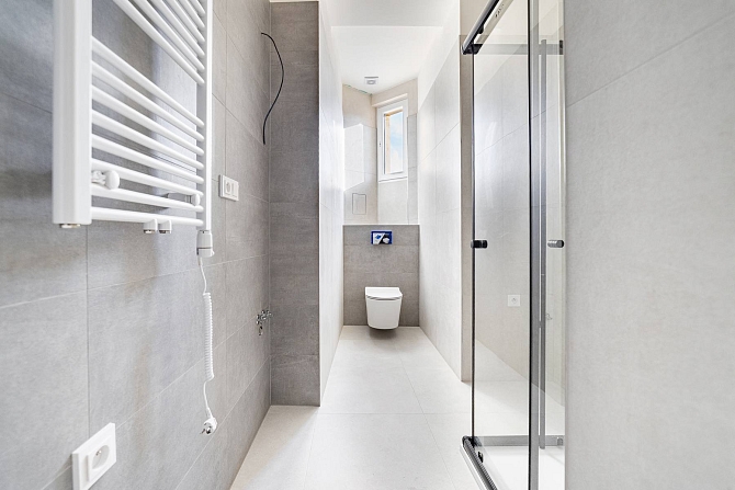 Po vstupu do bytu se ocitnete v předsíni (1,1 m2), ze které vedou dveře do moderní koupelny (3,3 m2) se sprchovým koutem, umyvadlem, přípojkou na pračku a toaletou. Druhými dveřmi vstoupíte do pokoje (17,83 m2) s kuchyňským koutem, ze kterého můžete vstoupit na balkon (2,4 m2) situovaný do klidného vnitrobloku a do druhého pokoje (18,47 m2).