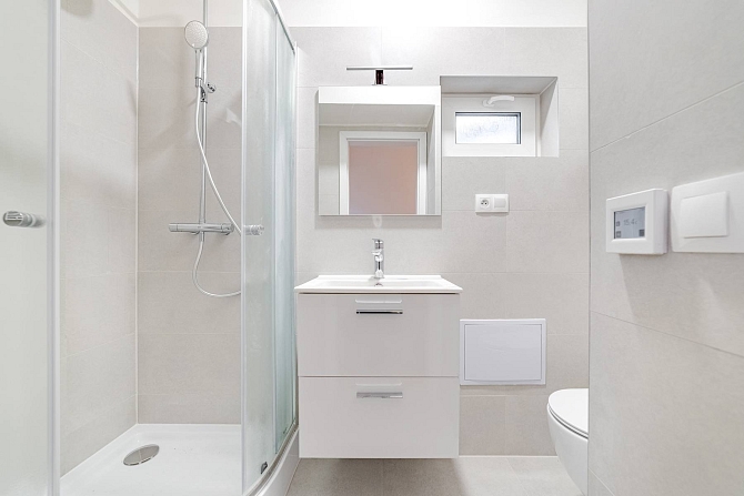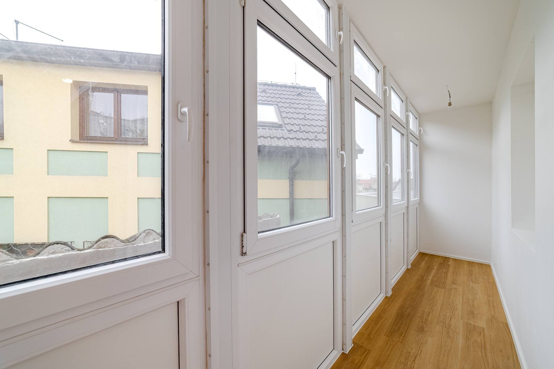 Moderní a prostorná jednotka o dispozici 2+kk (51 m²), balkonem (2,5 m²) a zasklenou pavlačí (6,5 m²).