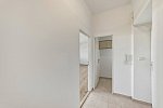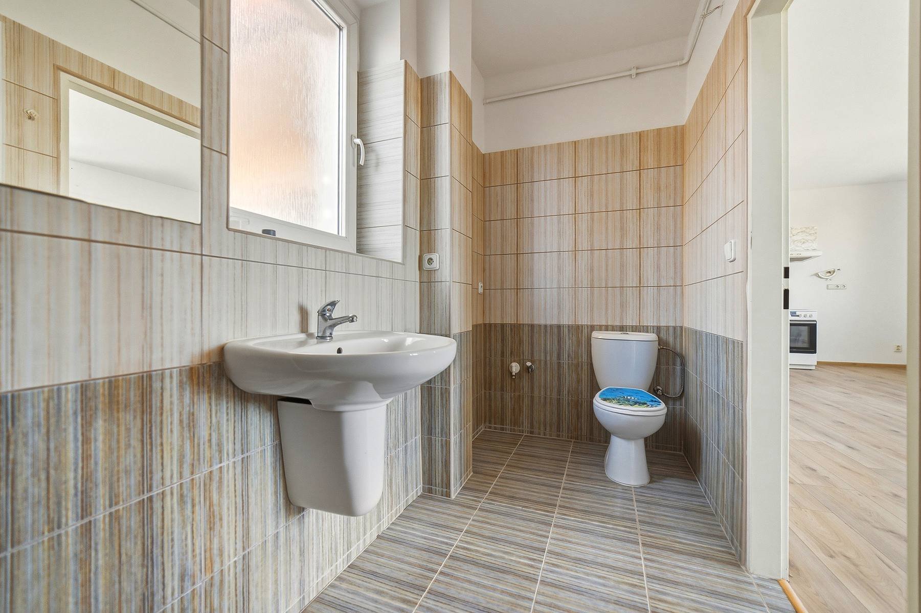 V obytných místnostech jsou nové vinylové podlahy. V předsíni, komoře a koupelně je keramická dlažba.