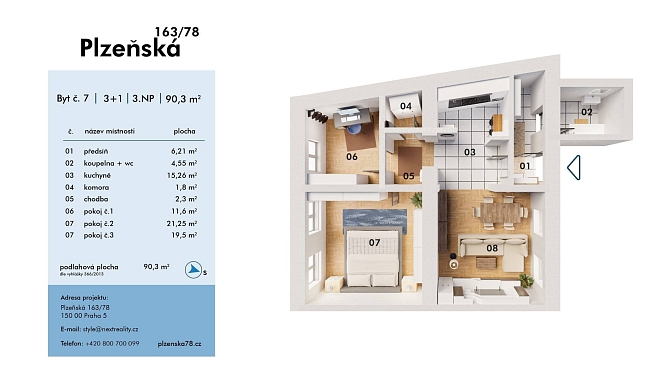 Bytová jednotka disponuje 82,47m2 se nachází v 3.NP činžovního domu. Dispozice: předsíň (6,21), koupelna + toaleta (4,55m2), kuchyně (15,26m2), komora (1,8m2), chodba (2,3m2), obývací pokoj (21,25m2), ložnice (11,6m2), dětský pokoj (19,5 m2).
