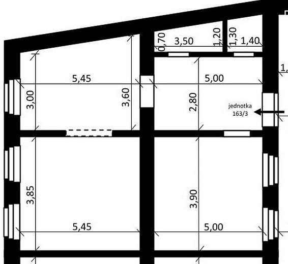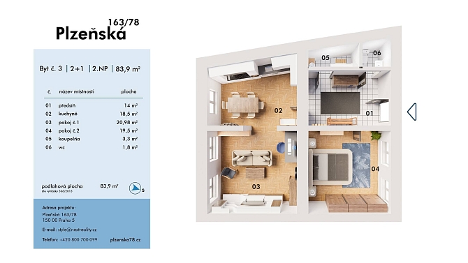 Bytová jednotka disponuje 83,9m2 podlahové plochy a nachází se v 2.NP činžovního domu.