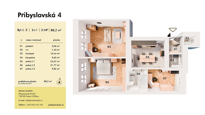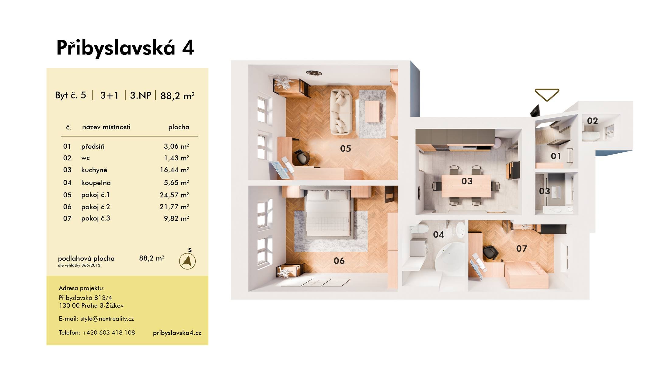 Bytová jednotka disponuje 88,2 m2 podlahové plochy a nachází se v 3.NP činžovního domu. Dispozice: pokoj (21,77m2), ložnice (9,82m2), obývací pokoj (24,7m2), kuchyň (16,44m2), koupelna (5,65m2), WC (1,43m2), předsíň (3,06m2).