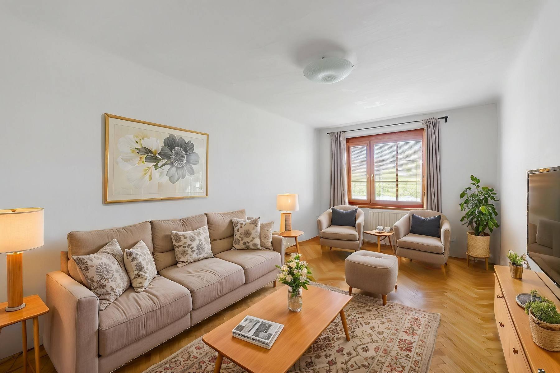 V pokojích jsou položeny dřevěné podlahy, v předsíni, koupelnách, toaletě a komoře je položena dlažba.